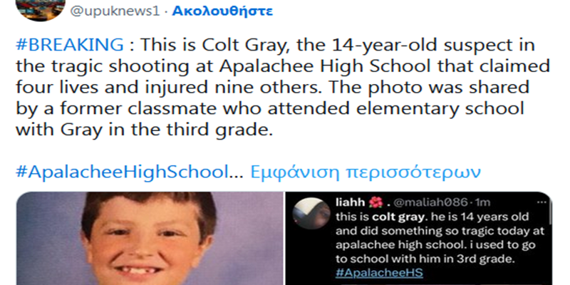 Ο έφηβος θα αντιμετωπίσει «δίωξη για φόνο» και «θα δικαστεί ως ενήλικος», πρόσθεσε ο αξιωματούχος κατά τη διάρκεια συνέντευξης Τύπου μπροστά στο λύκειο Απαλάτσι, στην πόλη Γουάιντερ, κάπου 70 χιλιόμετρα βορειοανατολικά από την Ατλάντα.